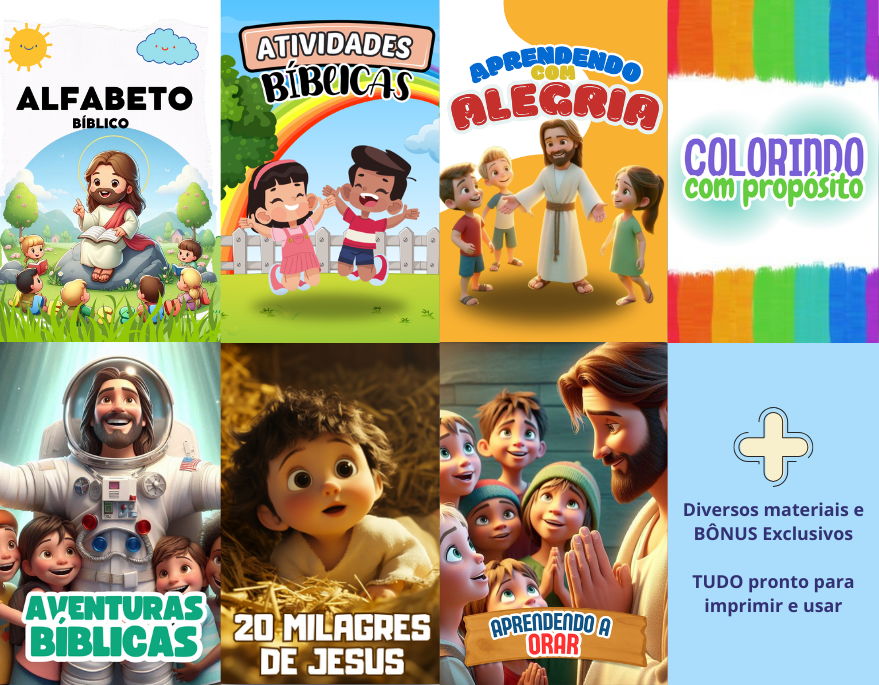 Você terá acesso a um material exclusivos feito por professores Cristãos para pais e outros professores! São mais de 600 atividades Bíblicas prontas para imprimir e utilizar com as crianças a partir dos 3 anos.